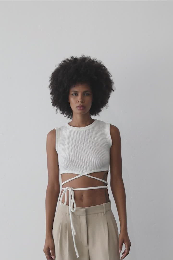 Meet the Maia Top, your new not-so-basic top. Featuring a classic crew neck, a sleeveless shoulder and ties designed to wrap around the waist.