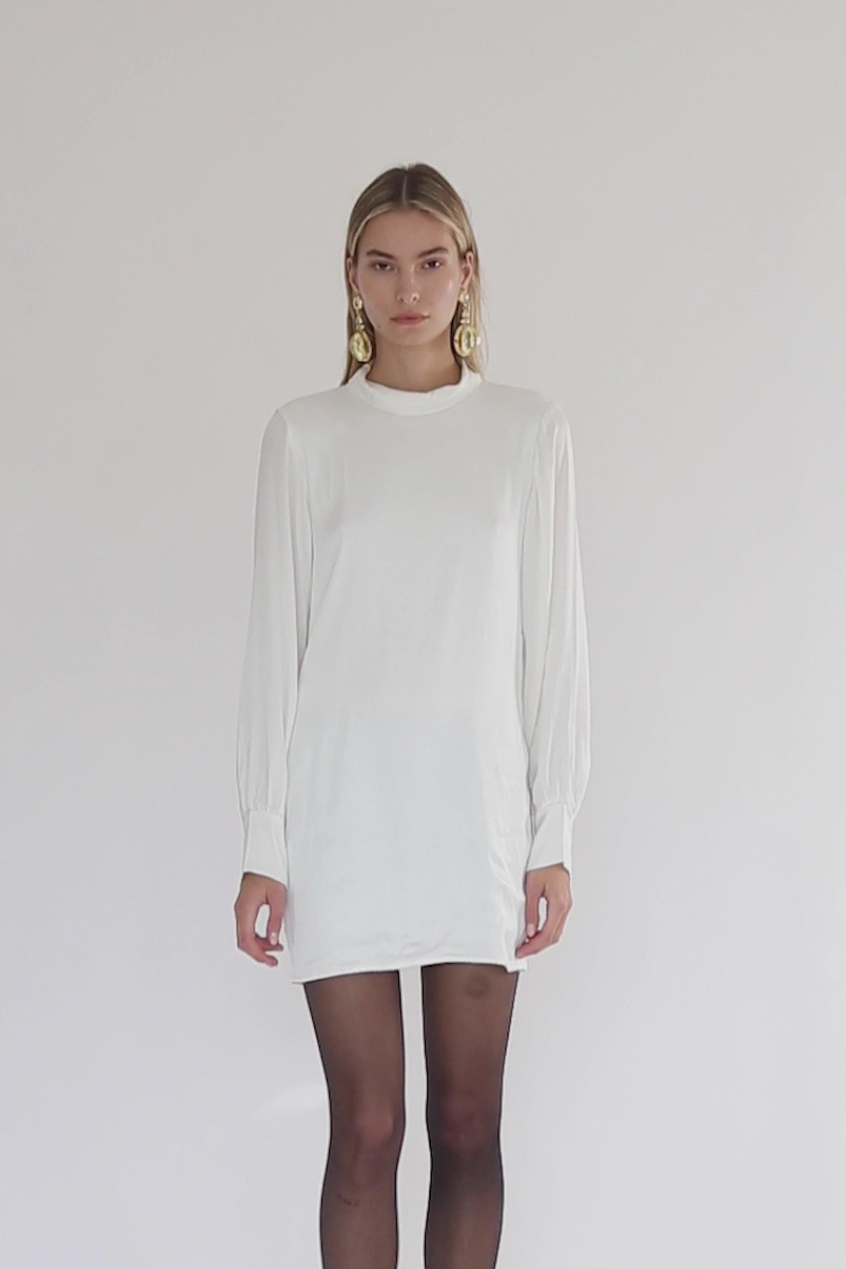 The Beverly dress, this satin dream of a dress is fully lined through out the body. Featuring a dramatic open and super low back with covered button closures behind the neck.