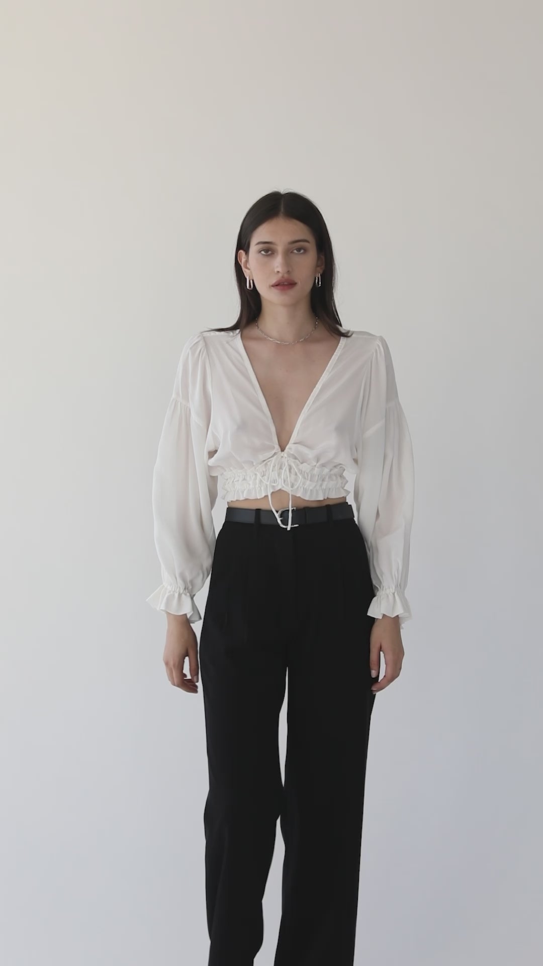 The Lex top, features a cropped length, long balloon sleeves, and a plunging neckline that is adjustable by drawstrings. Will pair perfectly with any of your favorite bottoms!