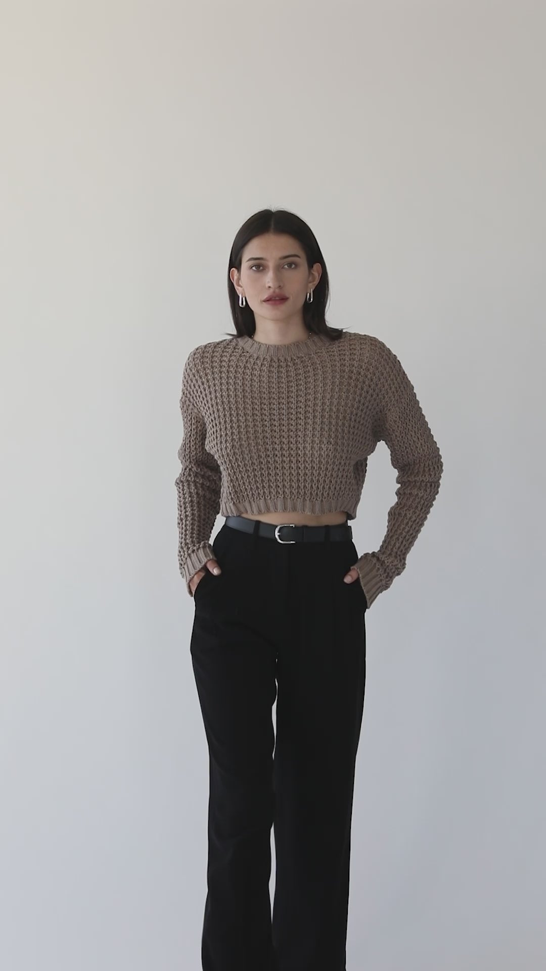 A Fall must have, meet the Paige sweater, featuring a cropped length, a loose fit, long sleeves and loose knit weave.